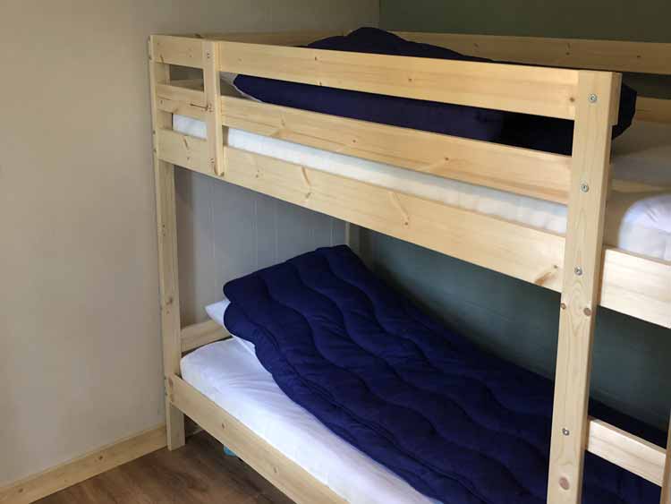 De bungalow heeft vier slaapplekken. In de ene slaapkamer staat een tweepersoonsbed en in de andere slaapkamer een stapelbed. Een kinderbed kan eventueel bij de receptie worden gehuurd. Het is mogelijk op de bank te slapen, maar daar is geen beddengoed voor aanwezig.