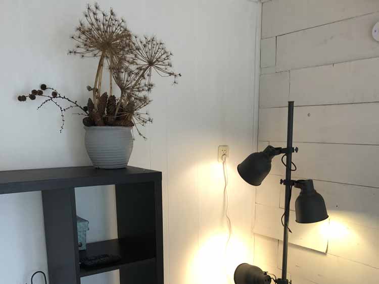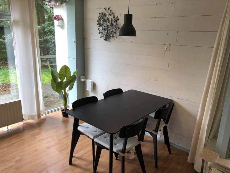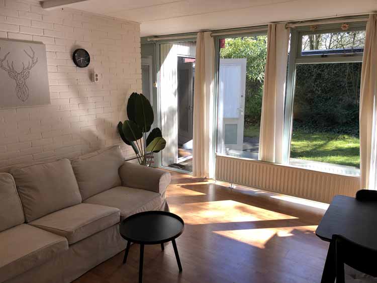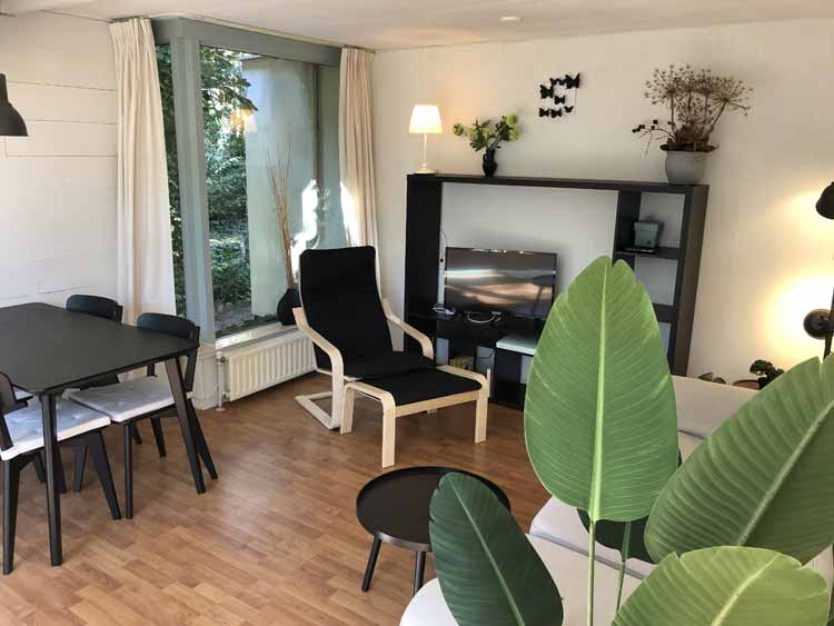 In de woonkamer staat een driepersoonsbank, een luie stoel en een eettafel. De televisie komt met een abonnement van Ziggo en in de kast staan vele spelletjes en boeken.