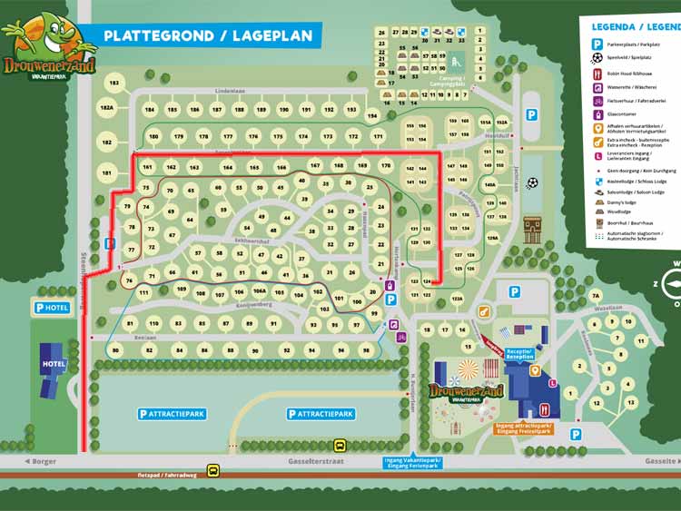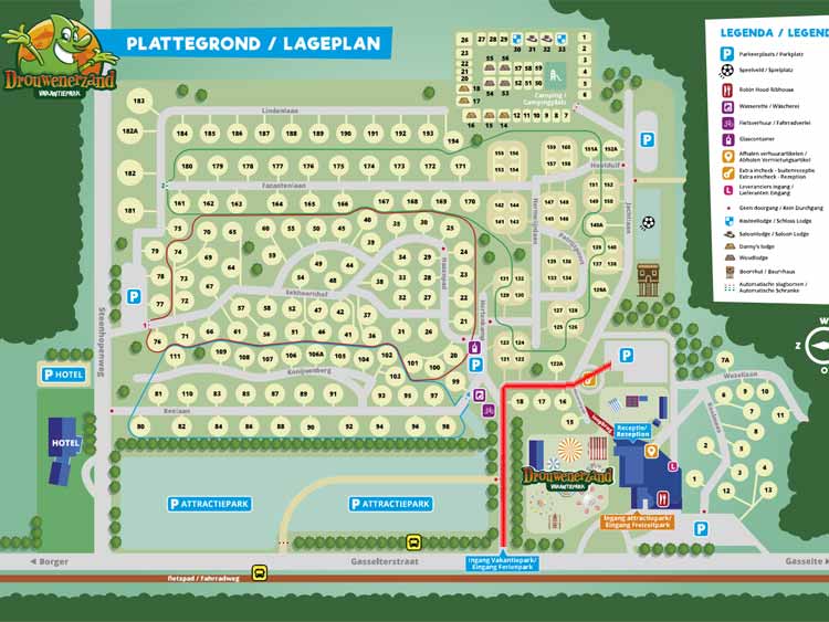 U kunt zich melden bij de receptie. Daar krijgt u de sleutel van bungalow 124 en de slagboom. U kunt bij het huis parkeren. Hou wel rekening met de openingstijden van de receptie.